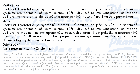 Codexial Hydrolotio je hydrofilní promašťující emulze na péči o kůži. Je speciálně vyvinuta pro normální až velmi suchou kůži. Díky své tekuté konzistenci se snadno aplikuje, rychle proniká do pokožky a nezanechává mastný film. Emulze s pumpičkou.