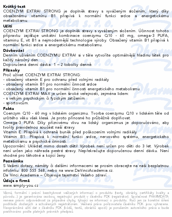 COENZYM EXTRA! STRONG je doplněk stravy s vyváženým složením, který díky obsaženému vitamínu B1 přispívá k normální funkci srdce a energetickému metabolismu.