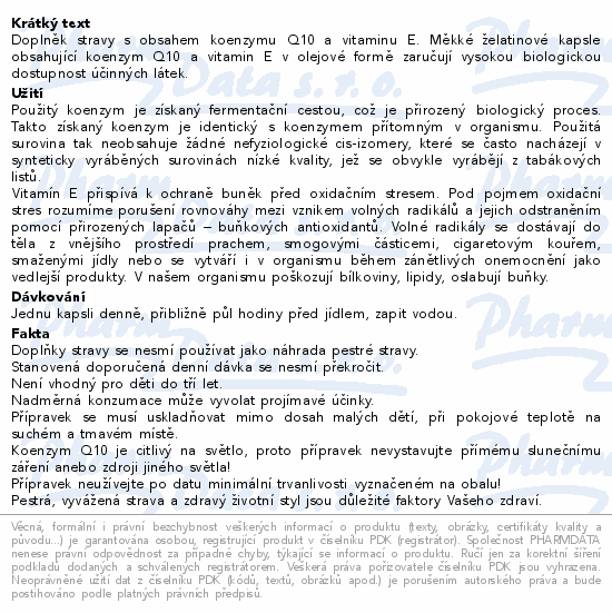 Doplněk stravy s obsahem koenzymu Q10 a vitaminu E. Měkké želatinové kapsle obsahující koenzym Q10 a vitamin E v olejové formě zaručují vysokou biologickou dostupnost účinných látek.