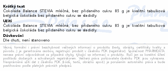 Čokoláda Balance STEVIA mléčná, bez přidaného cukru 85 g je kvalitní tabulková belgická čokoláda bez přidaného cukru se sladidly. Obsahuje sladidlo maltitol, při zvýšené konzumaci může mít projímavé účinky.