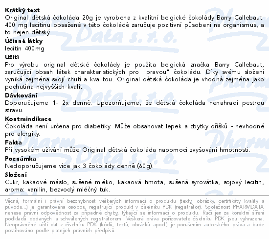 Original dětská čokoláda 20g je vyrobena z kvalitní belgické čokolády Barry Callebaut. 400 mg lecitinu obsažené v této čokoládě zaručuje pozitivní působení na organismus, a to nejen dětský.