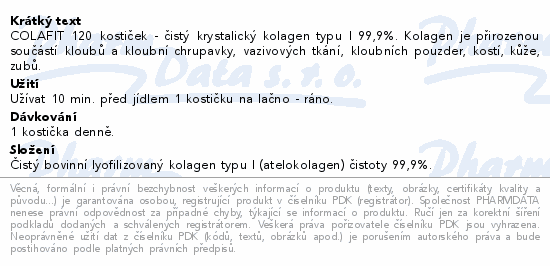 COLAFIT 120 kostiček - čistý krystalický kolagen typu I 99,9%. Kolagen je přirozenou součástí kloubů a kloubní chrupavky, vazivových tkání, kloubních pouzder, kostí, kůže, zubů.