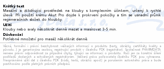 Masážní a zklidňující prostředek na klouby s komplexním účinkem, určený k rychlé úlevě. Při použití krému Akut Pro dojde k prokrvení pokožky a tím se usnadní průnik regeneračních složek do hloubky.