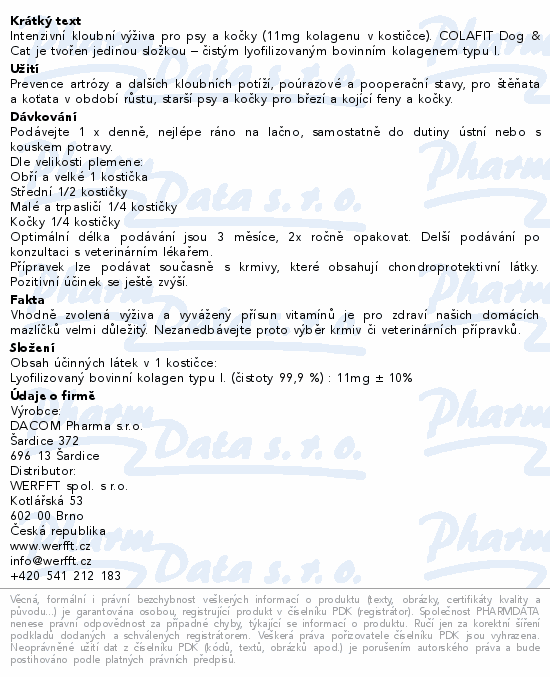 Intenzivní kloubní výživa pro psy a kočky (11mg kolagenu v kostičce). COLAFIT Dog & Cat je tvořen jedinou složkou – čistým lyofilizovaným bovinním kolagenem typu I.