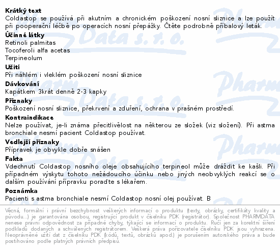 Coldastop se používá při akutním a chronickém poškození nosní sliznice a lze použít při pooperační léčbě po operacích nosní přepážky. Čtěte pozorně příbalový leták.