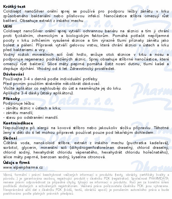 Coldisept nanoSilver orální sprej se používá pro podporu léčby zánětu v krku způsobeného bakteriální nebo plísňovou infekcí. Nanočástice stříbra omezují růst bakterií. Obsahuje extrakt z irského mechu.