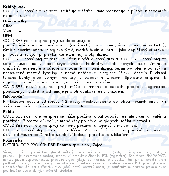 COLDISES nosní olej ve spreji zmírňuje dráždění, dále regeneruje a působí blahodárně na nosní sliznici.