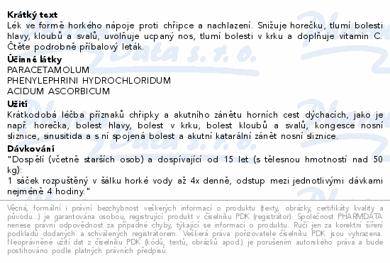 Lék ve formě horkého nápoje proti chřipce a nachlazení. Snižuje horečku, tlumí bolesti hlavy, kloubů a svalů, uvolňuje ucpaný nos, tlumí bolesti v krku a doplňuje vitamin C. Čtěte pozorně příbalový leták.