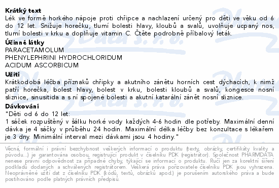 Lék ve formě horkého nápoje proti chřipce a nachlazení určený pro děti ve věku od 6 do 12 let. Snižuje horečku, tlumí bolesti hlavy, kloubů a svalů, uvolňuje ucpaný nos, tlumí bolesti v krku a doplňuje vitamin C. Čtěte pozorně příbalový leták.