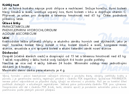 Lék ve formě horkého nápoje proti chřipce a nachlazení. Snižuje horečku, tlumí bolesti hlavy, kloubů a svalů, uvolňuje ucpaný nos, tlumí bolesti v krku a doplňuje vitamin C. Přípravek je určen pro dospělé s tělesnou hmotností nad 65 kg. Čtěte pozorně příbalový leták.