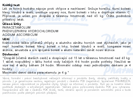 Lék ve formě horkého nápoje proti chřipce a nachlazení. Snižuje horečku, tlumí bolesti hlavy, kloubů a svalů, uvolňuje ucpaný nos, tlumí bolesti v krku a doplňuje vitamin C. Přípravek je určen pro dospělé s tělesnou hmotností nad 65 kg. Čtěte pozorně příbalový leták.