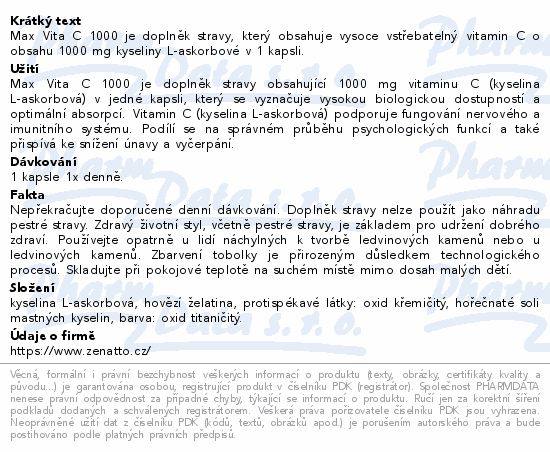 Max Vita C 1000 je doplněk stravy, který obsahuje vysoce vstřebatelný vitamin C o obsahu 1000 mg kyseliny L-askorbové v 1 kapsli.