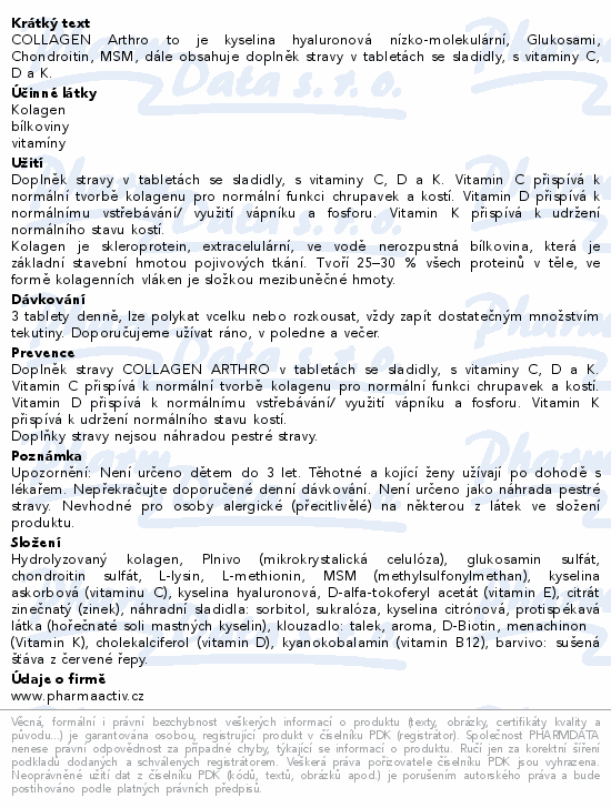 COLLAGEN Arthro to je kyselina hyaluronová nízko-molekulární, Glukosami, Chondroitin, MSM, dále obsahuje doplněk stravy v tabletách se sladidly, s vitaminy C, D a K.