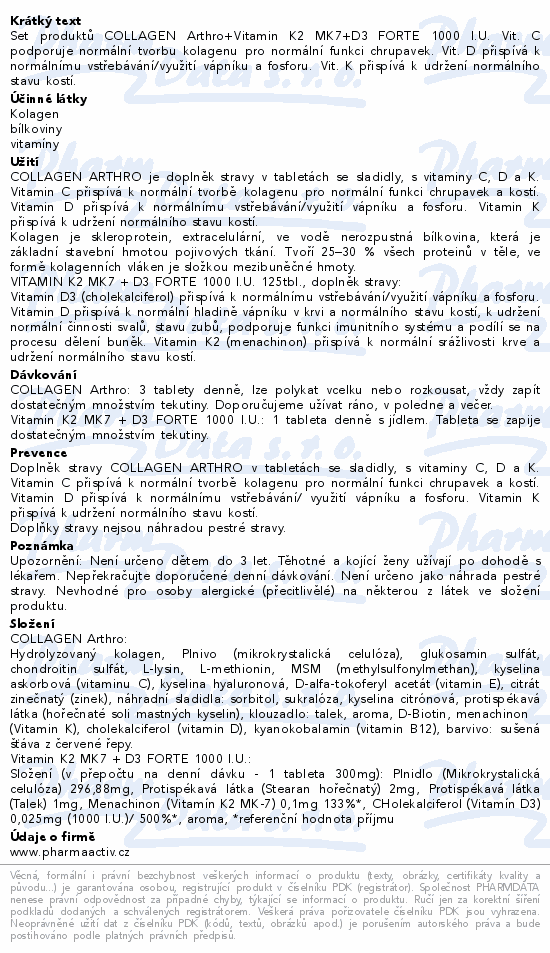 Set produktů COLLAGEN Arthro+Vitamin K2 MK7+D3 FORTE 1000 I.U. Vit. C podporuje normální tvorbu kolagenu pro normální funkci chrupavek. Vit. D přispívá k normálnímu vstřebávání/využití vápníku a fosforu. Vit. K přispívá k udržení normálního stavu kostí.