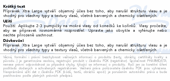Přípravek Xtra Large vytváří objemný účes bez toho, aby narušil strukturu vlasu a je vhodný pro všechny typy a textury vlasů, včetně barvených a chemicky ošetřených.