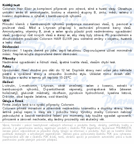 Colorwin Hair Elixir je komplexní přípravek pro zdravé, silné a husté vlasy. Obsahuje unikátní směs tří aminokyselin, biotinu a vitamínů skupiny B, zinku, mědi, selenu z kvasnic doplněnou o výtažek z bambusových výhonků.