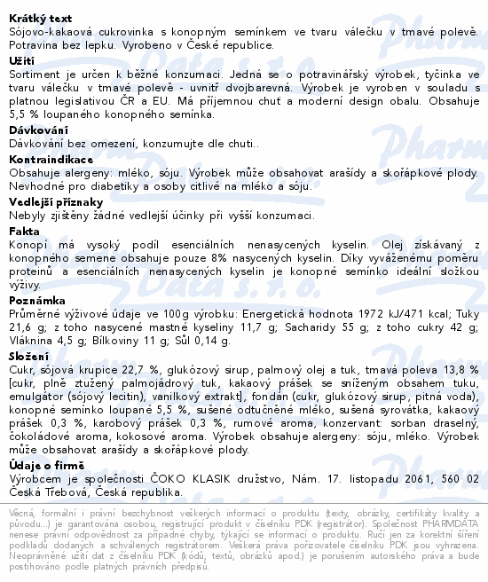 Sójovo-kakaová cukrovinka s konopným semínkem ve tvaru válečku v tmavé polevě. Potravina bez lepku. Vyrobeno v České republice.