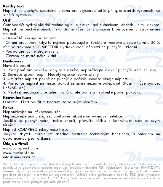 COMPEED Náplast na puchýře sportovní je speciálně určená pro zvýšenou zátěž při sportovních výkonech. Má o 20 % větší tlumící vrstvu než ostatní COMPEED náplasti pro okamžitou úlevu od bolesti kvůli tlaku a tření. Profil náplasti připomíná plástev a působí jako druhá kůže, je to díky tzv. hydrokoloidní technologii, která vytváří optimální prostředí pro nejlepší hojení. Také je ultra přilnavá, zúžené konce umožňují přizpůsobení se pohybu, zůstává na místě a vydrží tak několik dní. Je i voděodolná a diskrétní (průsvitné rohy splynou s povrchem pokožky).