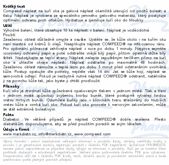COMPEED Náplast na kuří oka obsahuje aktivní hydrokoloidní gel, který okamžitě ulevuje od bolesti a pomáhá odstranit nepříjemné kuří oko. Nejen, že náplast zůstane na místě až po několik dní, protože je voděodolná, zároveň také poskytuje ochranu proti tření a tlaku.