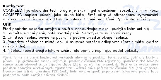 COMPEED hydrokoloidní technologie je aktivní gel s částicemi absorbujícími vlhkost. COMPEED náplast působí jako druhá kůže, čímž přispívá přirozenému vyrovnávání vlhkosti. Okamžitě ulevuje od tlaku a bolesti. Chrání proti tření. Rychlé zhojení rány.