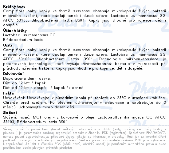 Compliflora baby kapky ve formě suspense obsahuje mikrokapsule živých bakterií mléčného kvašení, které osidlují tenké i tlusté střevo: Lactobacillus rhamnosus GG ATCC 53103, Bifidobacterium lactis BS01. Kapky jsou vhodné pro kojence, děti i dospělé.