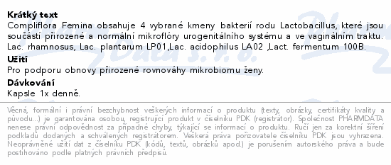 Compliflora Femina obsahuje 4 vybrané kmeny bakterií rodu Lactobacillus, které jsou součástí přirozené a normální mikroflóry urogenitálního systému a ve vaginálním traktu. Lac. rhamnosus, Lac. plantarum LP01,Lac. acidophilus LA02 ,Lact. fermentum 100B.