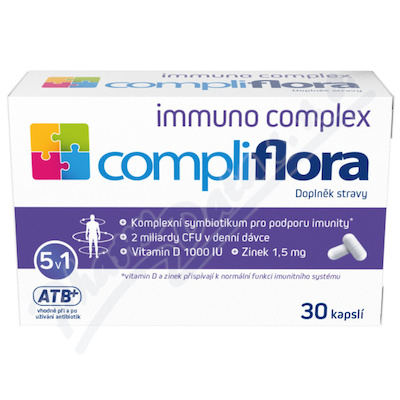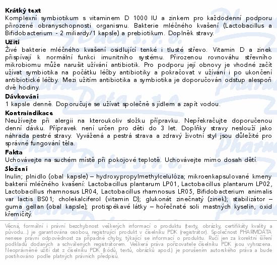 Komplexní symbiotikum s vitaminem D 1000 IU a zinkem pro každodenní podporu přirozené obranyschopnosti organismu. Bakterie mléčného kvašení (Lactobacillus a Bifidobacterium - 2 miliardy/1 kapsle) a prebiotikum. Doplněk stravy.
