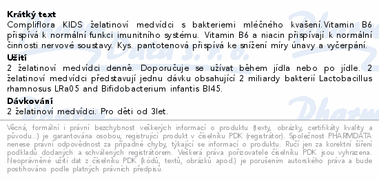 Compliflora KIDS želatinoví medvídci s bakteriemi mléčného kvašení.Vitamin B6 přispívá k normální funkci imunitního systému. Vitamin B6 a niacin přispívají k normální činnosti nervové soustavy. Kys. pantotenová přispívá ke snížení míry únavy a vyčerpání.