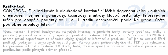 CONDROSULF je indikován k dlouhodobé kontinuální léčbě degenerativních kloubních onemocnění, zejména gonartrózy, koxartrózy a artrózy kloubů prstů ruky. Přípravek je určen pro dospělé pacienty ve II. a III. stadiu onemocnění podle Kellgrena. Čtěte pozorně příbalový leták.