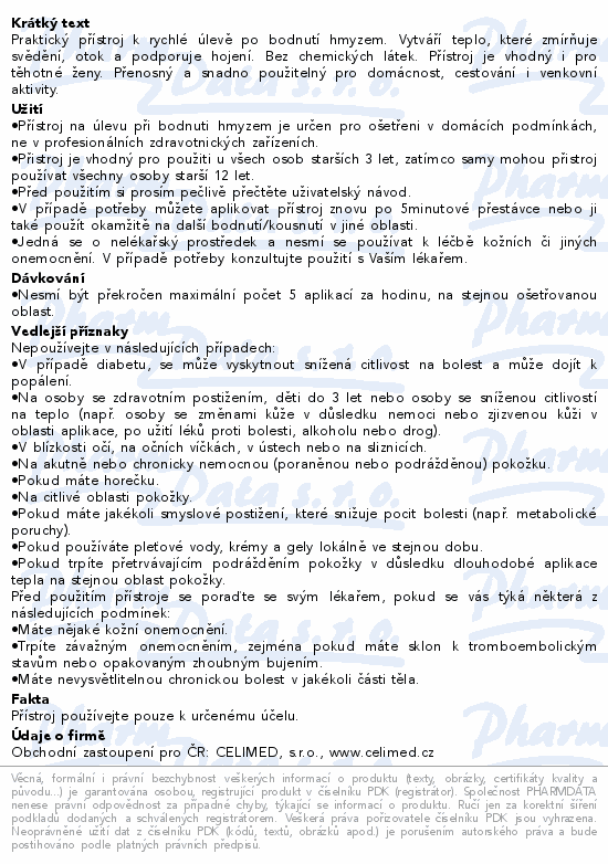 Praktický přístroj k rychlé úlevě po bodnutí hmyzem. Vytváří teplo, které zmírňuje svědění, otok a podporuje hojení. Bez chemických látek. Přístroj je vhodný i pro těhotné ženy. Přenosný a snadno použitelný pro domácnost, cestování i venkovní aktivity.