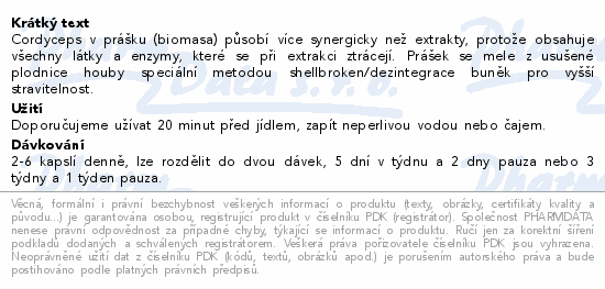 Cordyceps v prášku (biomasa) působí více synergicky než extrakty, protože obsahuje všechny látky a enzymy, které se při extrakci ztrácejí. Prášek se mele z usušené plodnice houby speciální metodou shellbroken/dezintegrace buněk pro vyšší stravitelnost.