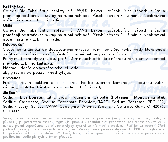 Corega Bio Tabs čisticí tablety ničí 99,9% bakterií způsobujících zápach z úst a pomáhají odstraňovat skvrny na zubní náhradě. Působí během 3 - 5 minut. Neabrazivní složení šetrné k zubní náhradě.