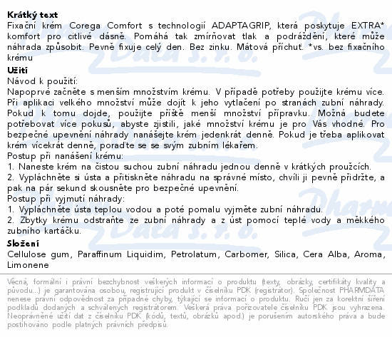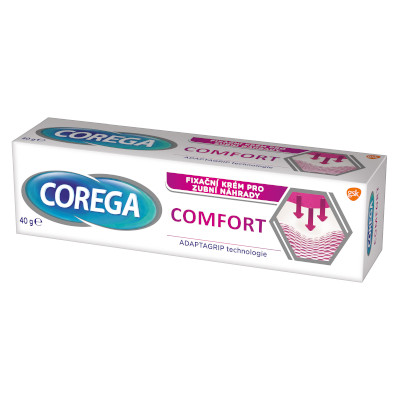 Fixační krém Corega Comfort s technologií ADAPTAGRIP, která poskytuje EXTRA* komfort pro citlivé dásně. Pomáhá tak zmírňovat tlak a podráždění, které může náhrada způsobit. Pevně fixuje celý den. Bez zinku. Mátová příchuť. *vs. bez fixačního krému