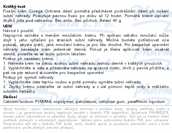 Fixační krém Corega Ochrana dásní pomáhá předcházet podráždění dásní při nošení zubní náhrady. Poskytuje pevnou fixaci po dobu až 12 hodin. Pomáhá bránit ulpívání zbytků jídla pod náhradou. Bez zinku. Bez příchuti. Balení 40 g.