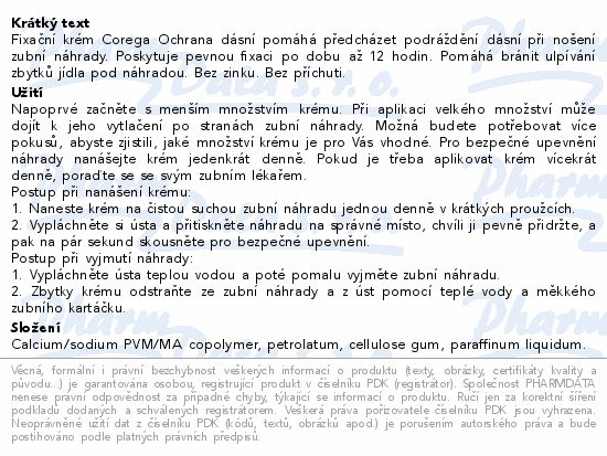 Fixační krém Corega Ochrana dásní pomáhá předcházet podráždění dásní při nošení zubní náhrady. Poskytuje pevnou fixaci po dobu až 12 hodin. Pomáhá bránit ulpívání zbytků jídla pod náhradou. Bez zinku. Bez příchuti.