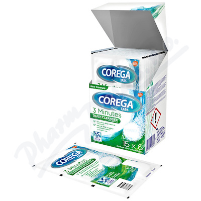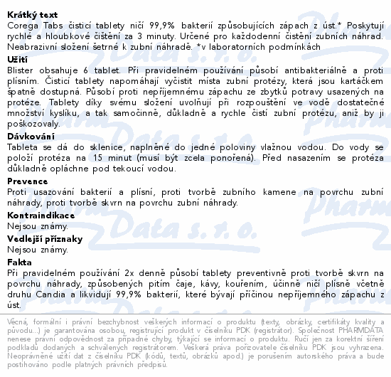 Corega Tabs čisticí tablety ničí 99,9% bakterií způsobujících zápach z úst.* Poskytují rychlé a hloubkové čištění za 3 minuty. Určené pro každodenní čistění zubních náhrad. Neabrazivní složení šetrné k zubní náhradě. *v laboratorních podmínkách
