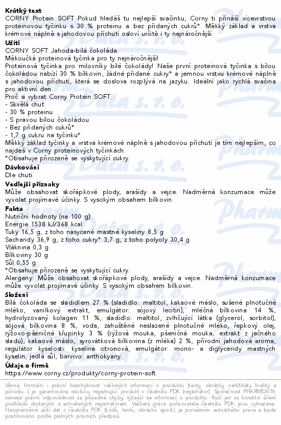 CORNY Protein SOFT Pokud hledáš tu nejlepší svačinku, Corny ti přináší vícevrstvou proteinovou tyčinku s 30 % proteinu a bez přidaných cukrů*. Měkký základ a vrstva krémové náplně s jahodovou příchutí osloví určitě i ty nejnáročnější.