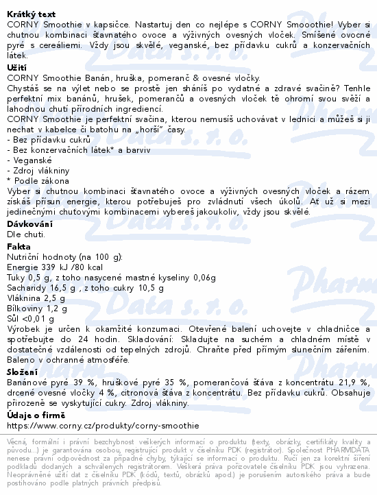CORNY Smoothie v kapsičce. Nastartuj den co nejlépe s CORNY Smooothie! Vyber si chutnou kombinaci šťavnatého ovoce a výživných ovesných vloček. Smíšené ovocné pyré s cereáliemi. Vždy jsou skvělé, veganské, bez přídavku cukrů a konzervačních látek.