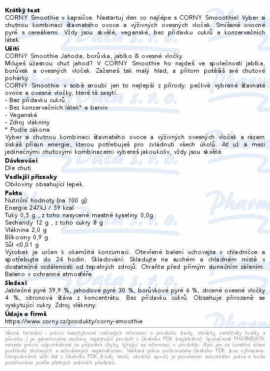 CORNY Smoothie v kapsičce. Nastartuj den co nejlépe s CORNY Smooothie! Vyber si chutnou kombinaci šťavnatého ovoce a výživných ovesných vloček. Smíšené ovocné pyré s cereáliemi. Vždy jsou skvělé, veganské, bez přídavku cukrů a konzervačních látek.