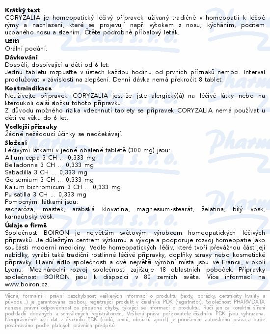 CORYZALIA je homeopatický léčivý přípravek užívaný tradičně v homeopatii k léčbě rýmy a nachlazení, které se projevují např. výtokem z nosu, kýcháním, pocitem ucpaného nosu a slzením. Čtěte pozorně příbalový leták.