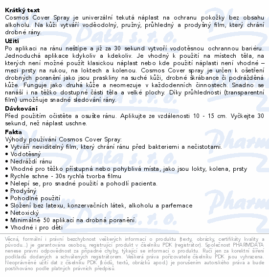 Cosmos Cover Spray je univerzální tekutá náplast na ochranu pokožky bez obsahu alkoholu. Na kůži vytváří voděodolný, pružný, průhledný a prodyšný film, který chrání drobné rány.