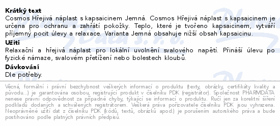 Cosmos Hřejivá náplast s kapsaicinem Jemná. Cosmos Hřejivá náplast s kapsaicinem je určena pro ochranu a zahřátí pokožky. Teplo, které je tvořeno kapsaicinem, vytváří příjemný pocit úlevy a relaxace. Varianta Jemná obsahuje nižší obsah kapsaicinu.