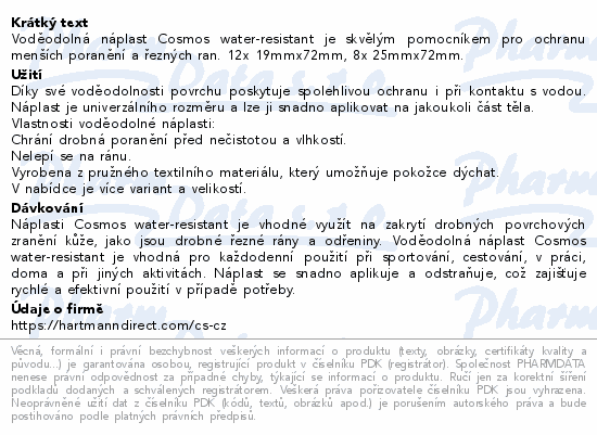 Voděodolná náplast Cosmos water-resistant je skvělým pomocníkem pro ochranu menších poranění a řezných ran. 12x 19mmx72mm, 8x 25mmx72mm.