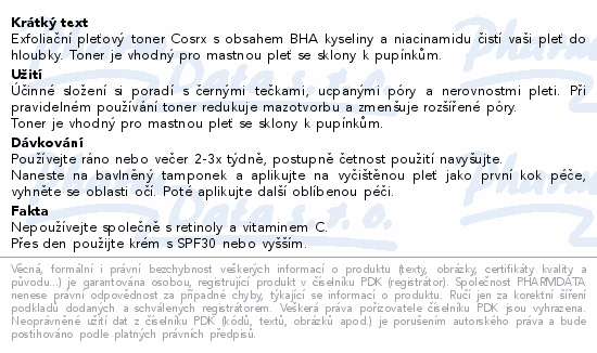 Exfoliační pleťový toner Cosrx s obsahem BHA kyseliny a niacinamidu čistí vaši pleť do hloubky. Toner je vhodný pro mastnou pleť se sklony k pupínkům.