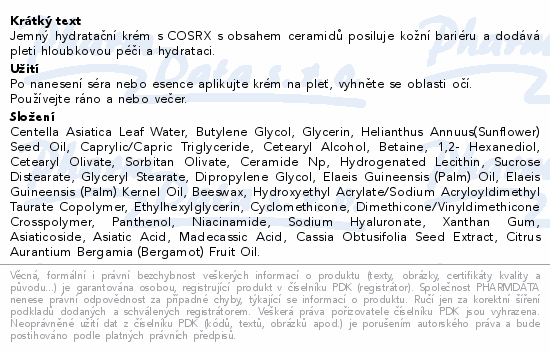 Jemný hydratační krém s COSRX s obsahem ceramidů posiluje kožní bariéru a dodává pleti hloubkovou péči a hydrataci.