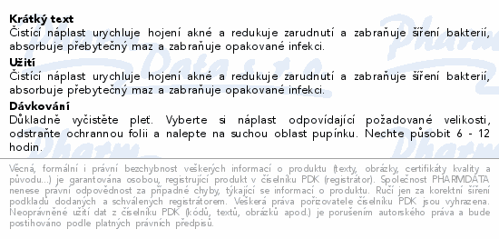 Čistící náplast urychluje hojení akné a redukuje zarudnutí a zabraňuje šíření bakterií, absorbuje přebytečný maz a zabraňuje opakované infekci.