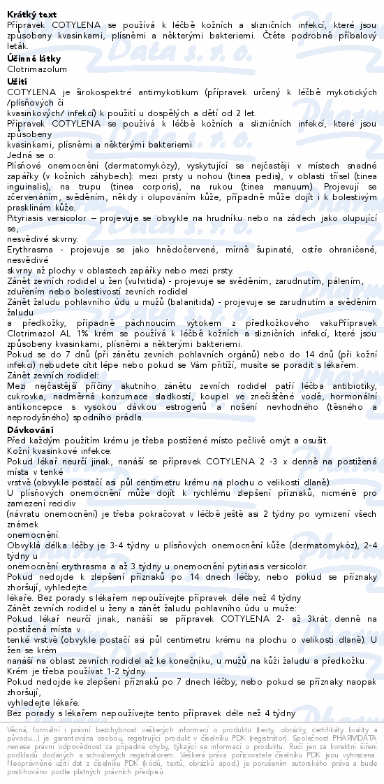 Přípravek COTYLENA se používá k léčbě kožních a slizničních infekcí, které jsou způsobeny kvasinkami, plísněmi a některými bakteriemi. Čtěte pozorně příbalový leták.