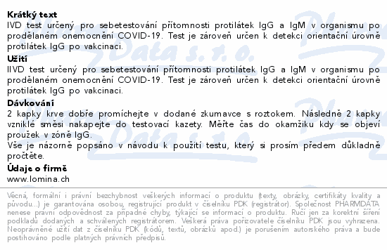 IVD test určený pro sebetestování přítomnosti protilátek IgG a IgM v organismu po prodělaném onemocnění COVID-19. Test je zároveň určen k detekci orientační úrovně protilátek IgG po vakcinaci.