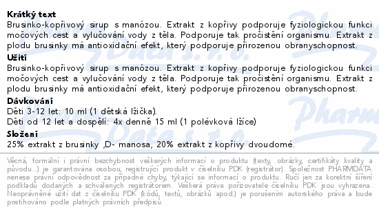 Brusinko-kopřivový sirup s manózou. Extrakt z kopřivy podporuje fyziologickou funkci močových cest a vylučování vody z těla. Podporuje tak pročistění organismu. Extrakt z plodu brusinky má antioxidační efekt, který podporuje přirozenou obranyschopnost.