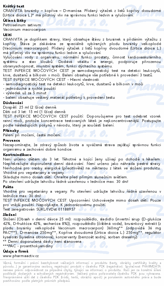 CRANVITA brusinky – kopřiva – D-manósa. Přidaný výtažek z listů kopřivy dvoudomé (Urtica dioica L.)* má příznivý vliv na správnou funkci ledvin a vylučování.
